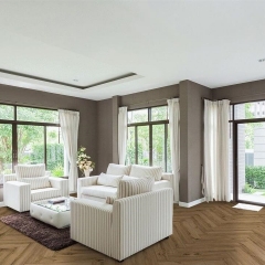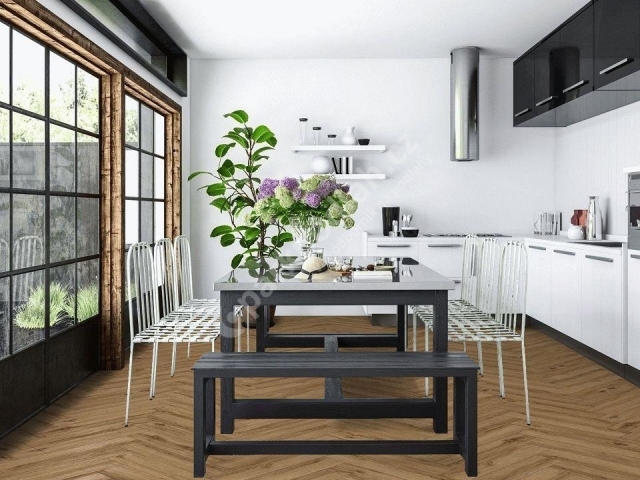 Vinylová SPC plovoucí podlaha od německého výrobce Falquon. P1006 HB Dub Jackson. Herringbone (rybí kost) - nově vivynuta generace SPC podlahových krytin e.marble® na minerální bázi bez formaldehydu. Podlaha je voděodolná, odolná proti oděru.