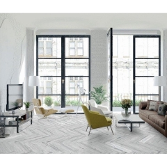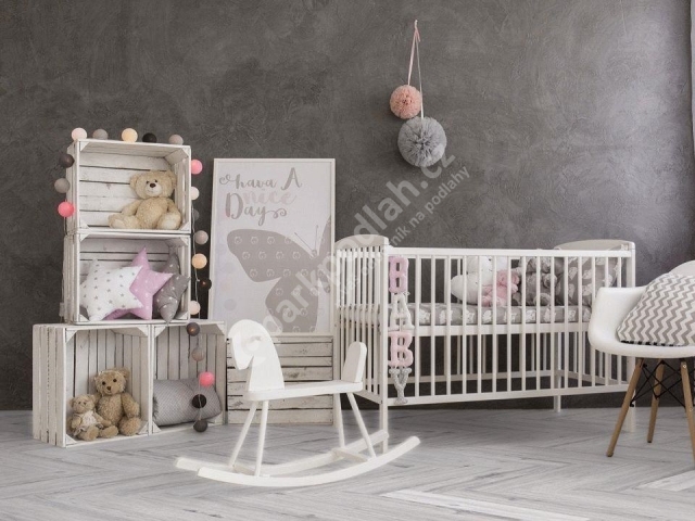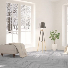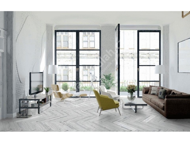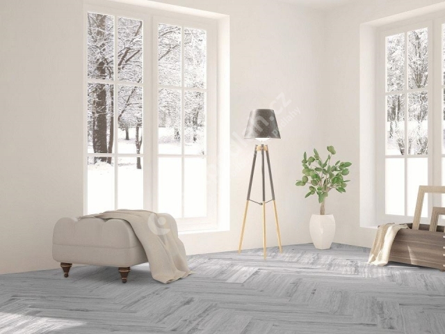 Vinylová SPC plovoucí podlaha od německého výrobce Falquon. P1007 HB Dub ledový. Herringbone (rybí kost) - nově vivynuta generace SPC podlahových krytin e.marble® na minerální bázi bez formaldehydu. Podlaha je voděodolná, odolná proti oděru.