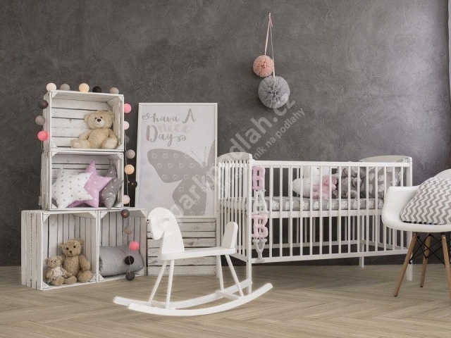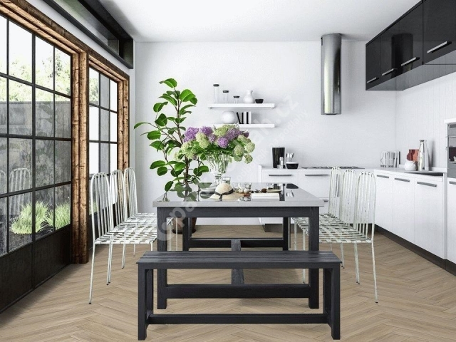 Vinylová SPC plovoucí podlaha od německého výrobce Falquon. P6001 HB Dub Tuscon. Herringbone (rybí kost) - nově vivynuta generace SPC podlahových krytin e.marble® na minerální bázi bez formaldehydu. Podlaha je voděodolná, odolná proti oděru.