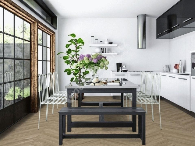 Vinylová SPC plovoucí podlaha od německého výrobce Falquon. P6002 HB Dub York. Herringbone (rybí kost) - nově vivynuta generace SPC podlahových krytin e.marble® na minerální bázi bez formaldehydu. Podlaha je voděodolná, odolná proti oděru.