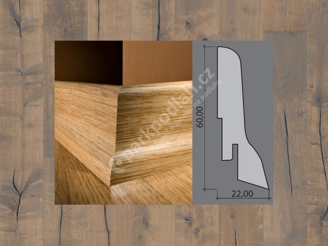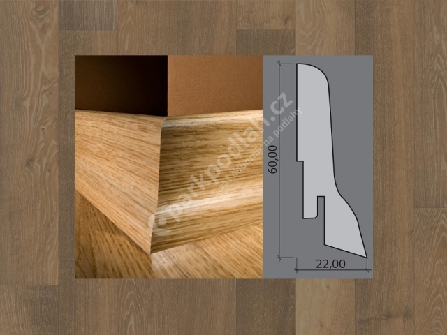 Obvodová lišta soklová od švédského výrobce Kährs. Typ lišty 60x22mm, dekor Dub Sture, Dub Handbörd.