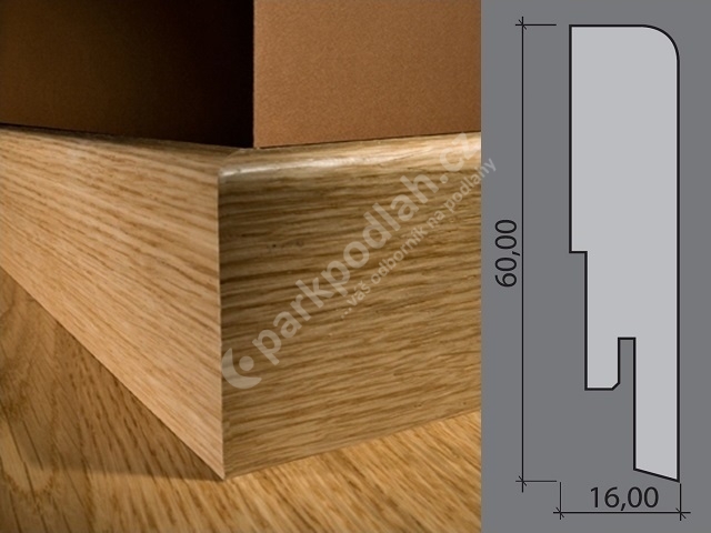 Obvodová lišta soklová od švédského výrobce Kährs. Typ lišty 60x16mm, dekor Jasan Stream.