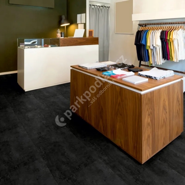 Vinylová plovoucí podlaha od německého výrobce Karndean. Dekor 55605 Metalstone černý, kolekce Projectline Acoustic Click.