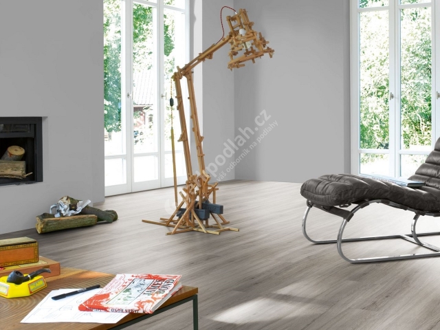 Vinylová SPC plovoucí podlaha od německého výrobce Parador. Kolekce Basic 5.3 SPC, dekor Dub pastelově šedý, selský vzor, V4.