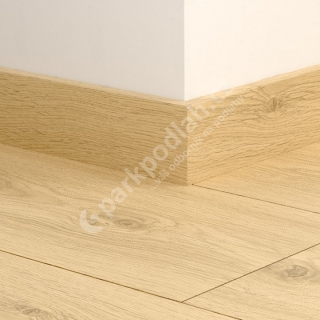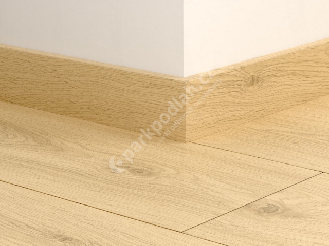 Obvodová lišta soklová od belgického výrobce Quick-Step. 58x12mm, 5802 Dub pouštní šedobéžový. Stabilní MDF jádro těchto lišt je potažené vysoce kvalitní laminátovou fólií a tímto se lišta stává mimořádně odolnou proti mechanickému i jinému namáhání. Montáž lišty se provádí nácvakem na originální plechové klipy (svorky), kdy hlavním předpokladem pro tuto montáž je dobrá rovinnost stěn. Alternativním způsobem montáže je lepení na oboustrannou pásku nebo na montážní lepidlo, možno i v kombinaci s přibíjením kalenými kolářskými hřebíčky nebo šroubováním. 58x12mm- originální lišta k vaší podlaze, to nejlepší řešení ...